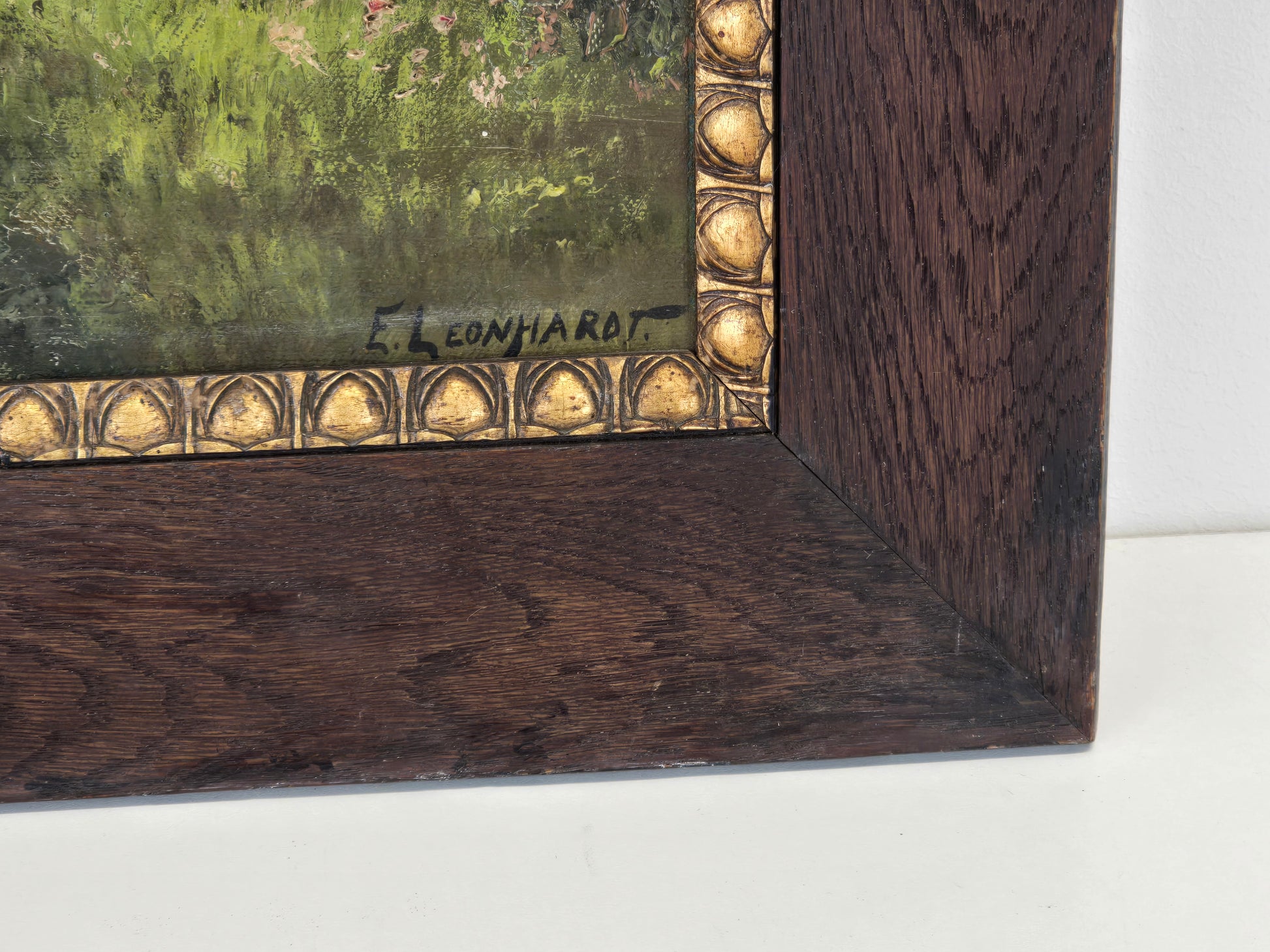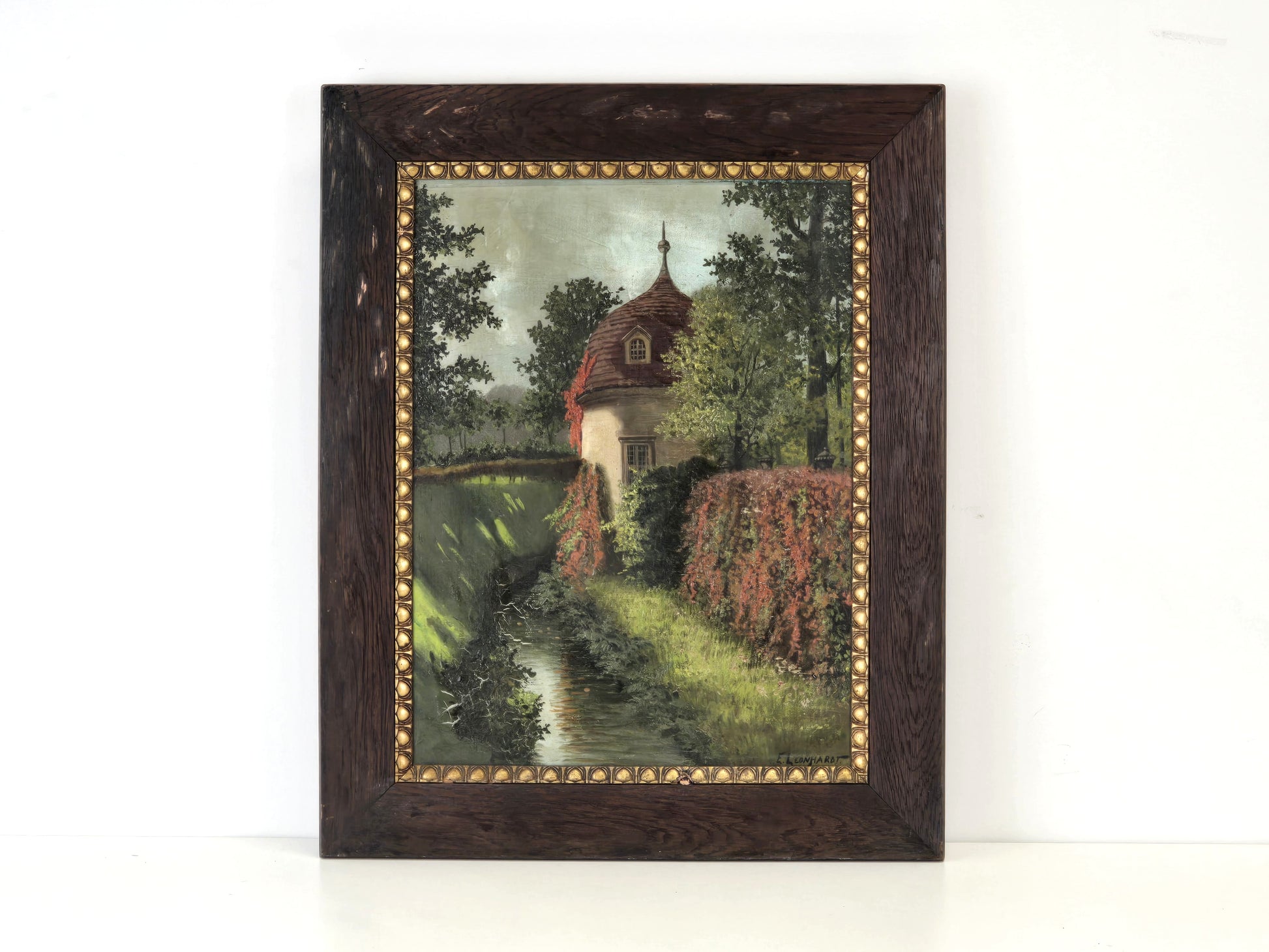 Beschreibung : Hochwertiges Originalgemälde von Ernst Leonhardt. Dargestellt ist eine idyllische Szene mit einem von herbstlichem Wein bewachsenen Turmgebäude an einem ruhigen Fließgewässer. Die meisterhafte Lichtführung und die herbstliche Farbpalette machen dieses Werk zu einem besonderen Blickfang. Inklusive historischem Rahmen und Herkunftsnachweis.