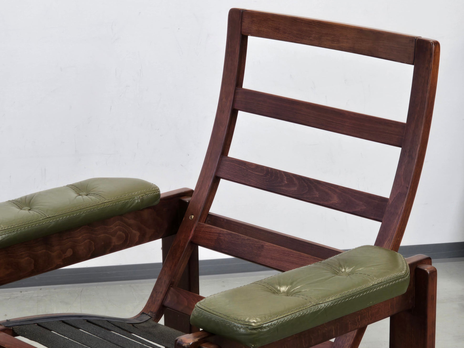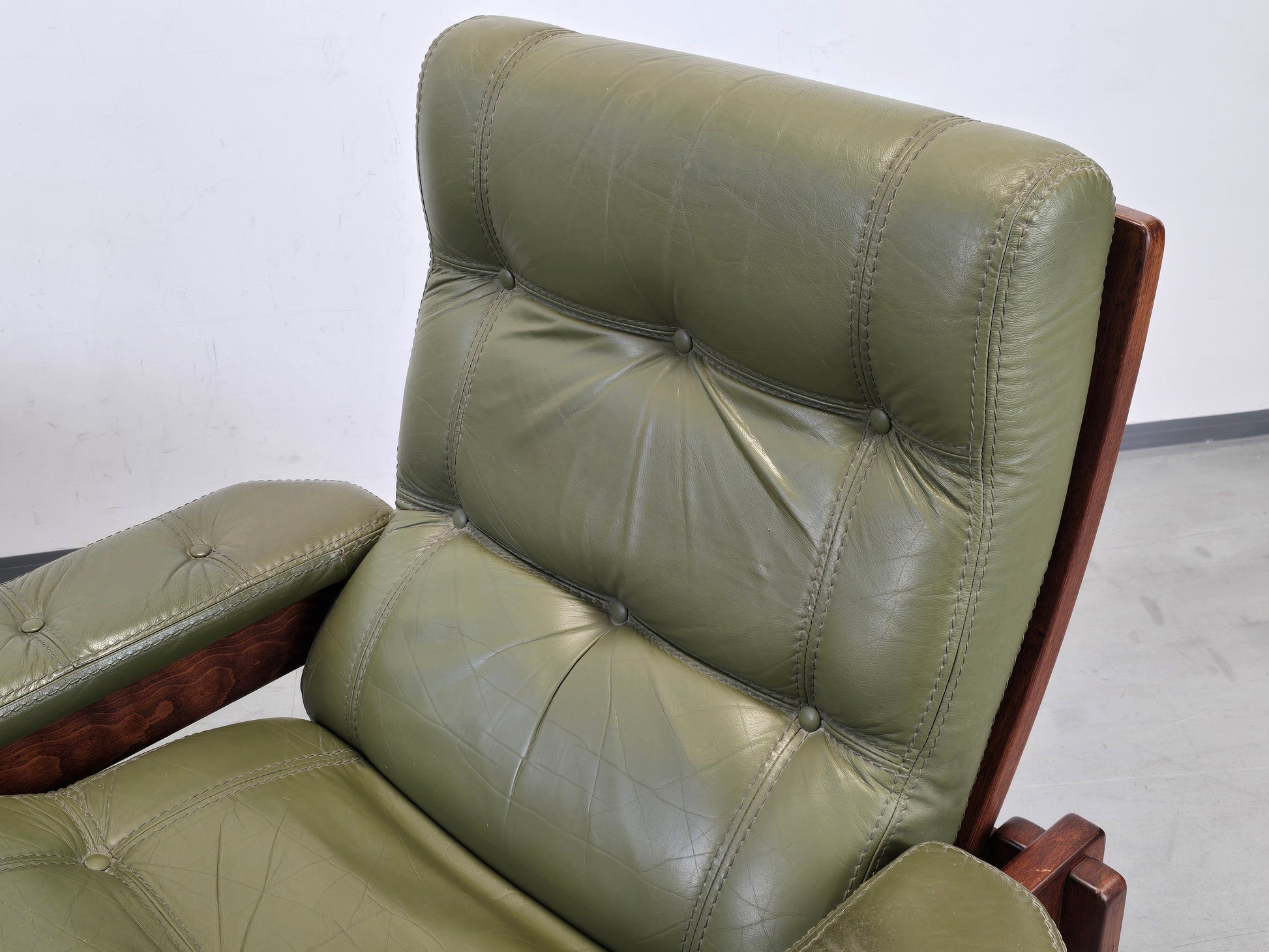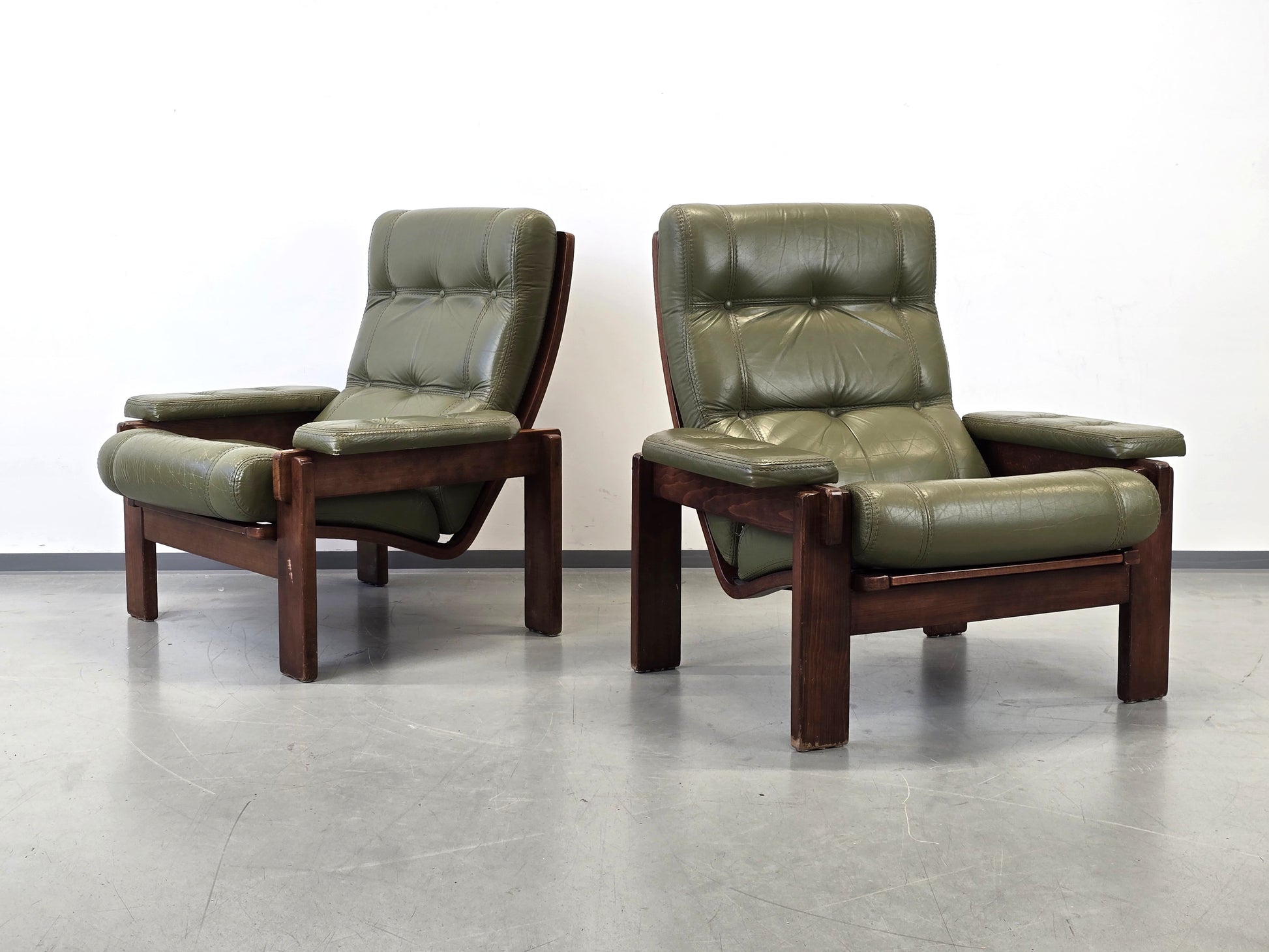 Beschreibung : Diese originalen Vintage Sessel bestechen durch ihr organisches, skandinavisch inspiriertes Design. Der dunkle Holzrahmen harmoniert perfekt mit dem olivgrünen Leder. Ein echter Klassiker für Liebhaber von hochwertigem Vintage-Interieur, der sowohl durch Optik als auch durch extrem hohen Sitzkomfort überzeugt.