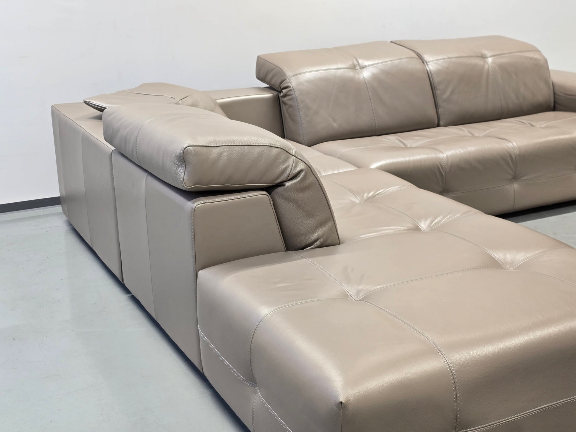 Ausstattung: Manuell verstellbare Kopfstützen zur individuellen Komfortanpassung, massive Unterkonstruktion, edle Ledersteppung, Designer-Füße.