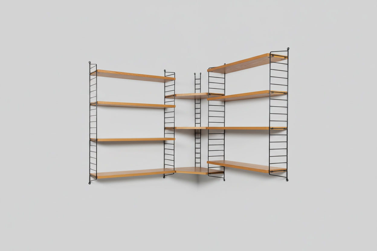 Originales Vintage "Nisse Strinnig" String Eckegal bestehend aus : 4x Metallleitern, 1x Eckregalleiter, 8x Regalboden und 3x Eckregalboden