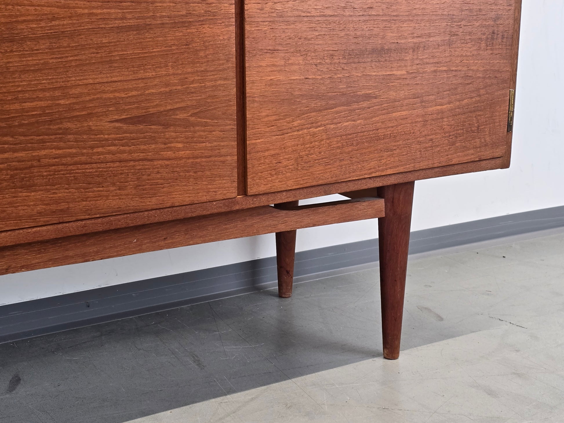 Ausstattung : 4 Türen (davon 2 abschließbar, Schlüssel vorhanden), 4 mittige Schubladen mit organisch geformten Griffmulden, verstellbare Einlegeböden, konische Vollholz-Füße mit Querverstrebung.