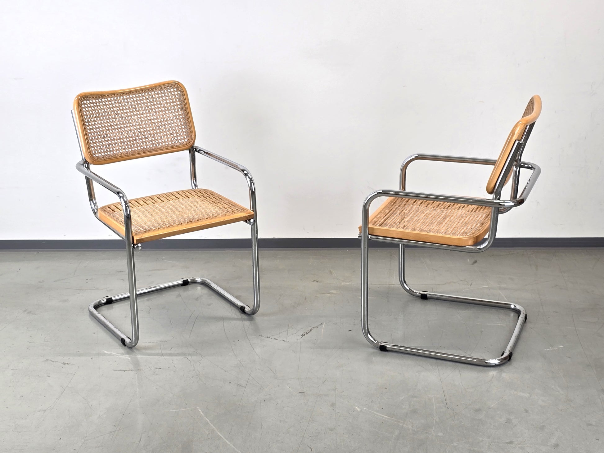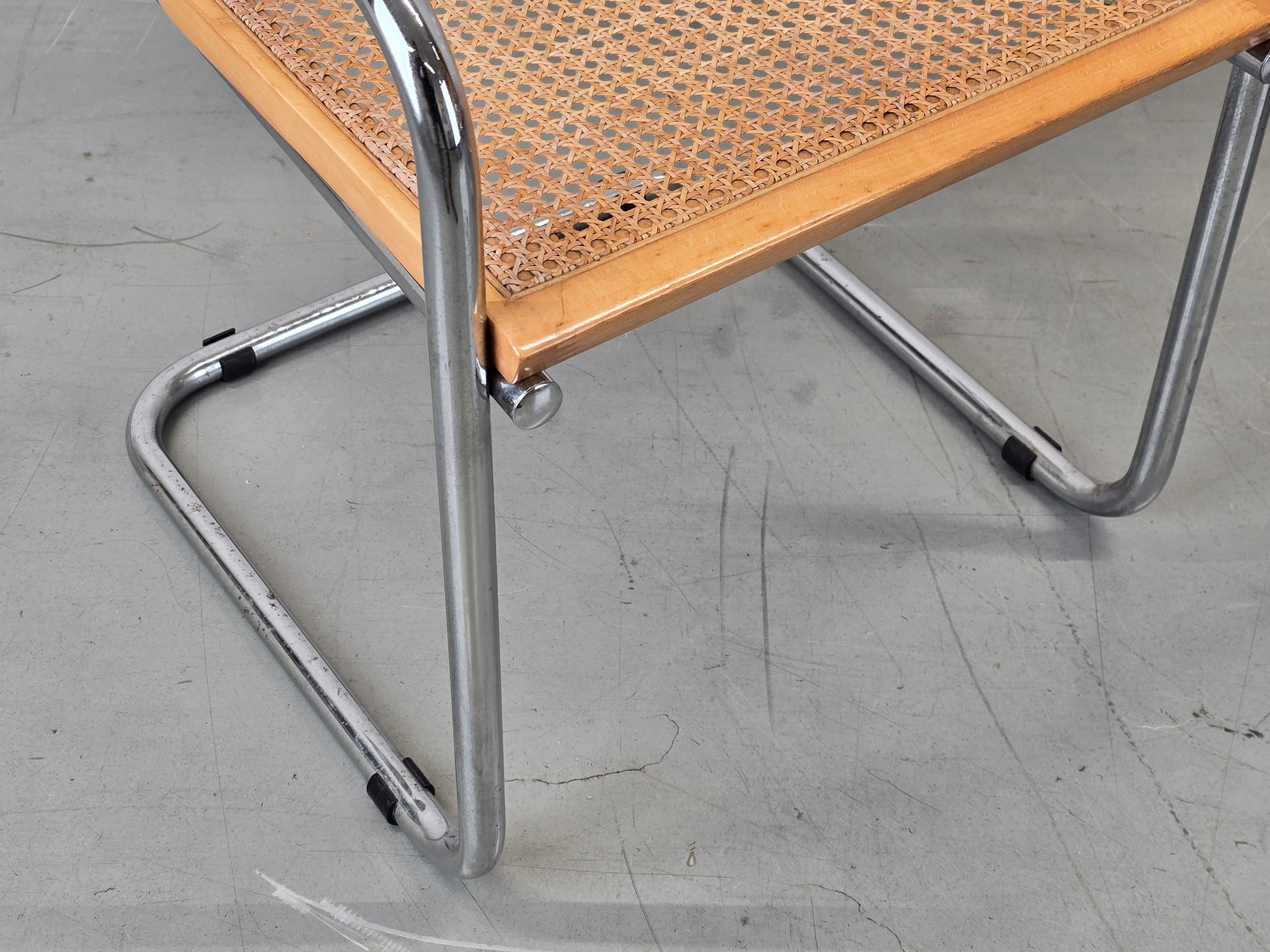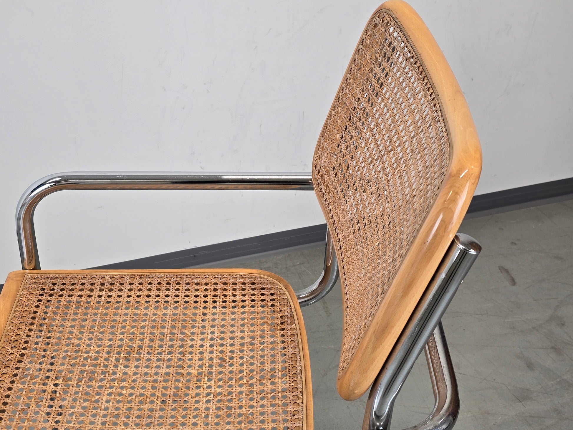 Der Zustand der beiden Designklassiker ist gut und gepflegt. Das Rohrgeflecht ist stabil, straff gespannt und weist keine Beschädigungen oder Löcher auf. An den Chromgestellen sowie an den Holzkanten sind lediglich minimale, altersübliche Gebrauchsspuren zu finden, die den authentischen Vintage-Charakter unterstreichen.