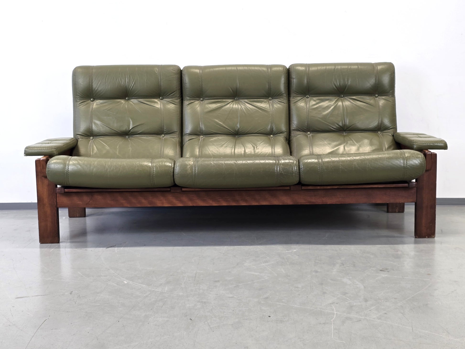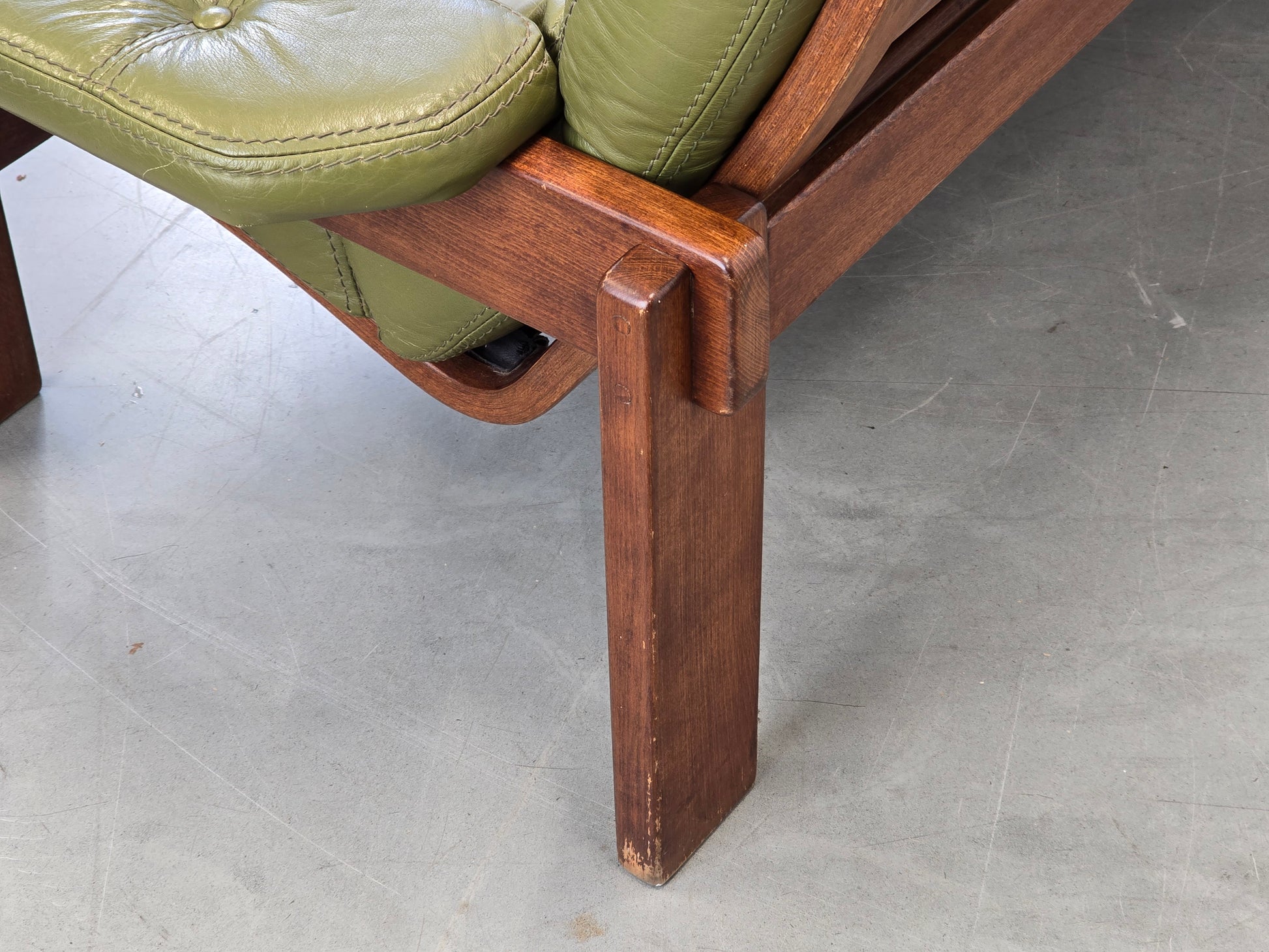 Beschreibung : Passend zum Sessel-Set präsentieren wir hier das dänische 3-Sitzer Sofa . Das Sofa besticht durch seine markante, offene Holzstruktur an der Rückseite und das charakteristische olivgrüne Leder. Ein zeitloses Statement-Piece für Liebhaber skandinavischen Designs.