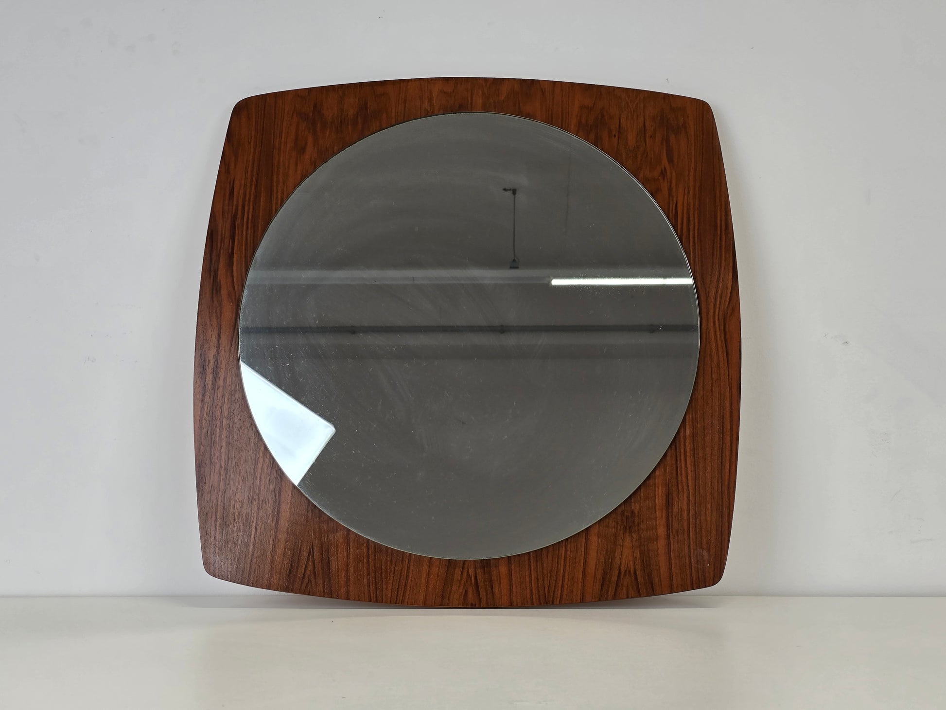Beschreibung : Wunderschöner, quadratischer Wandspiegel aus der Mid Century Ära. Der Rahmen besticht durch eine sanft gewölbte Linienführung und die markante Maserung des Nussbaumholzes. Ein zeitloses Designobjekt, das perfekt in moderne Wohnkonzepte oder klassische Vintage-Interieurs passt.